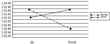Интересные результаты прослеживались в показателях времени преодоления дистанции третьими спортсменами. В экспериментальной группе изменение результатов произошло с 1.03.90 до 1.02.80 с (выраженное улучшение показателей), в контрольной группе результат ухудшился - с 1.03.30 до 1.03.71 с, что показывает отрицательную тенденцию (рисунок 3.3). Снова на графике мы видим, как кривые пересекаются.
