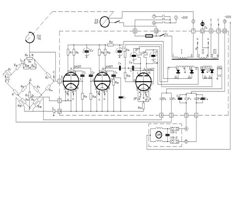 Степень воздействия дополнительного мостика можно менять, передвигая движок сопротивления R4. При перемещении движка в точку Д степень воздействия дополнительного мостика равна нулю. При перемещении движка сопротивления R4 в другое крайнее положение (точка F) компенсируется небаланс основного моста в пределах до 15% диапазона регулирования. Осуществление заданной программы производится движком реохорда Rр, который приводится в движение с помощью кулачка-лекала ПД от двигателя ДВ. Усилительный тракт состоит из четырёх каскадов усиления по напряжению, собранных по обычной схеме усилителя на сопротивлениях с ёмкостными связями и выходного фазочувствительного каскада усиления мощности. Сигнал, снимаемый с анода третьего каскада, подаётся на сетку четвёртого каскада усилителя напряжения через делитель R1 3, который выполняет функцию регулятора чувствительности. Переменная составляющая анодного тока 4-го каскада через конденсатор С6 поступает на сетки (соединённые накоротко) выходного каскада мощности.
