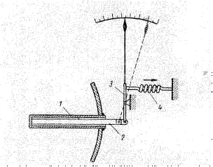 Термометры расширения. К этим термометрам относятся ртутные, спиртовые и другие термометры, в которых температуры определяются по высоте столба рабочей жидкости. К этим же термометрам относятся механические термометры - дилатометры, действие которых основано на относительном удлинении под влиянием температуры двух тел, имеющих различные коэффициенты линейного удлинения. На рис. 6 показано схематическое устройство термометра, у которого трубка 1 сделана из латуни, имеющей большой коэффициент линейного расширения. Стержень 2 сделан из инвара (64% Fe и 36% Ni), имеющего ничтожно малый коэффициент линейного расширения. Разность в удлиненных между трубкой и стержнем передается при помощи рычага 3 и пружины 4 на стрелку.
