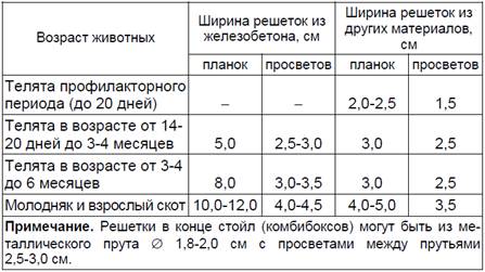 длине стойла. Размеры элементов решеток в зависимости от возраста крупного