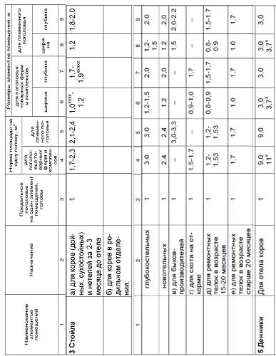 Ограждения денников, секций и клеток следует выполнять решетчатыми с шириной просветов: в ограждении денников для животных всех групп и клеток для телят - 0,15-0,25 м; секций (клеток) для молодняка - 0,30-0,35; для взрослого скота - 0,45-0,50 м. Разделители стойл и боксов предусматривают из горизонтальных или гнутых элементов (брусков, труб). Нижний горизонтальный ограждающий элемент бокса взрослого скота делают на высоте 0,40-0,50 м; для молодняка старше 12-месячного возраста - на высоте 0,30-0,35; для телят и молодняка до 12-месячного возраста - на высоте 0,20-0,25 м от пола бокса. Крайние стойла или боксы отделяют от поперечных проходов глухими перегородками высотой 1,0-1,2 м; встречные боксы должны иметь разделительную решетчатую перегородку высотой 1,2 м. Высоту перегородок секций принимают равной 1,5 м; ограждения денников - 1,5-1,8; ограждения стойл и боксов для взрослого скота и молодняка и групповых клеток для телят - 1,0; боксов для телят - 0,8; групповых клеток для молодняка - 1,3 м. Разделители стойл устраивают, как правило, через одно стойло на длину 1,1 м; разделители боксов не должны доходить до конца боксов для телят на 10-20, для остального поголовья на 20-30 см. Глубина открытых лотков должна быть не более 0,2 м. Дно индивидуальных клеток для телят решетчатое, на высоте 0,35-0,50 м от пола.