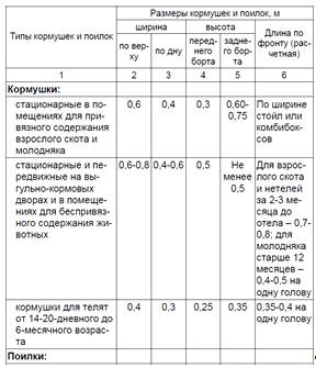 Высоту установки поилок и кормушек до верхнего переднего борта принимают, м: автопоилок для взрослого скота и молодняка - 0,5, для телят - 0,4 от пола помещения; кормушек для коров и молодняка при беспривязном содержании не более 0,6, при привязном - не более 0,4, для телят - 0,4 от уровня пола. При применении автоматической привязи-отвязи для коров высоту переднего борта кормушек в зданиях привязного содержания скота допускается увеличивать до 0,6 м без выреза для шеи.