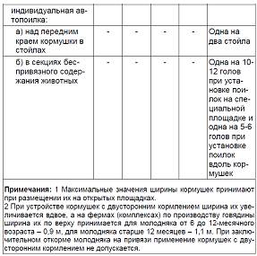 Примечания: 1. Максимальные значения ширины кормушек принимают при размещении их на открытых площадках.