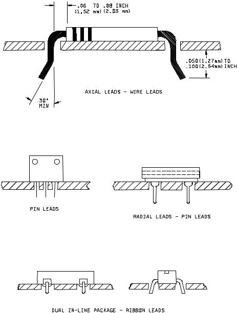 perpendicular to the board. Leads shall extend from .050 inch to .100 inch (1.27 mm to 2.54 mm) from the bottom of the board. Axial leads shall be bent at a 90° angle at a point between .06 inch and .08 inch (1.5 mm and 2.1 mm) from the body, eyelet fillet or weld unless otherwise specified (see figure 210-1).