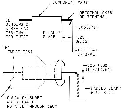 2.1 Mounting accessories. Provisions shall be made to permit mounting by the normal means so that the specimen can be tested in both directions, 180 degrees apart, of each of three mutually perpendicular axes, unless otherwise specified. Parts with axial terminations weighing less than 0.5 ounce shall be soldered to stand-off terminals, leaving a distance of 0.2 inch to 0.3 inch from the point of emergence to the terminals. Parts weighing 0.5 ounce and more shall be clamped so as to avoid any stress on the leads. Parts having radial leads and those of unusual mass distribution shall be mounted as specified in the individual specification. If loading, actuating, or polarizing currents are required, they shall be specified. Provisions shall be made for all electrical connections to be secure.