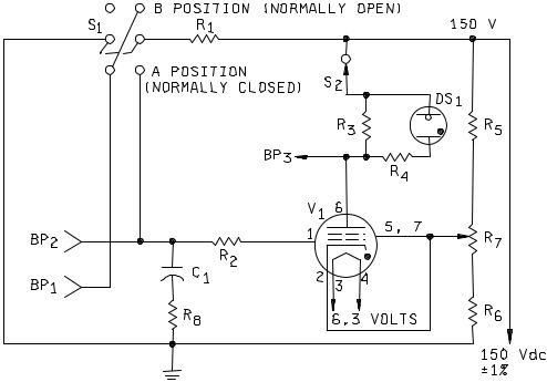 a.The chatter portion of figure 310-3, resistors R3 and R4 form a voltage divider with their junction at +2 volts. The closed contacts of the component under test, short-circuit R4 and place the base of transistor amplifier Q1 to ground potential. When the contacts under test "chatter" (open), resistor R4 is no longer shortcircuited and capacitor C1 starts to charge through R2 and R7 to +2 volts. The time necessary for C1 to charge to the correct bias-level is determined by the resistance of R2 and R7 and the capacitance value of C1. As transistor Q1 draws current through the gate of SCR1, the unit will fire and turn-on lamp DS1. Since in a silicon-controlled rectifier, the gate loses control after it is turned "on", the contacts can reclose at any