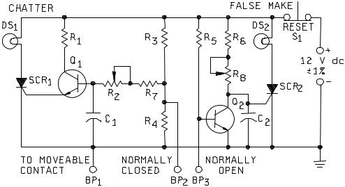 tied to the collector of transistor Q2, to rise to +12 volts. The rate of increase is determined by the value of C2 and R8. (For example: C2 = .002 F gives a 10-microsecond false-make time.) When the voltage reaches the gate turn-on level of SCR2, lamp DS2 will light, indicating a false closure of the open contacts.