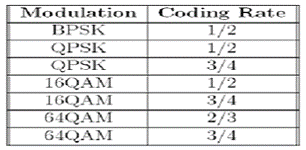Стандарт 802.16a/d визначає сім комбінацій модуляції і кодової залежності, які можуть використовуватися для того, щоб досягти різних співвідношень швидкості даних і надійності каналу, залежно від серйозності умов завмирань в каналі. Ці можливі комбінації показані в Табл.1. За рахунок використання модуляцій більш високого рівня можна збільшити швидкість даних, але при цьому погіршити надійність системи і навпаки.
