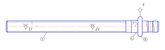 Поверхность А (1,2,3,4) является двойной направляющей базой и лишает винт четырех степеней свободы; поверхность Б (5) - установочная база, лишает одной степени свободы; поверхность В (6) - опорная база, лишает одной степени свободы.