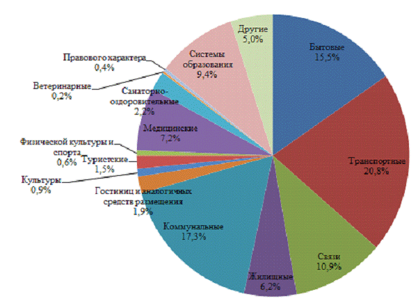 Наименьшая доля приходится на услуги по прокату (0,4%), изготовление и ремонт