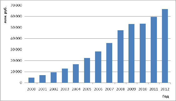 Таблица 4 - Динамика потребления платных услуг населением г. Уфы за 2000-2012 гг., млн. руб.