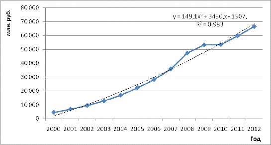 По проведенным расчетам за период 2000 - 2012 гг. объем платных услуг населению г. Уфы в среднем за год увеличивался на 5 166,2 млн. рублей, ежегодный рост объема платных услуг населению колебался от 181,7 млн. руб. в 2010 году до 11 518,9 млн. человек в 2008 году. По темпу прироста объем платных услуг населению города в среднем за год увеличивался на 25,18%. При этом ежегодные темпы прироста колебались от 0,34% в 2010 году до 51,2% в 2001 году. Среднегодовой объем платных услуг за 2000- 2012 гг. составил 32 042 млн. руб. Выявим тенденцию развития в рядах динамики объема платных услуг населению г. Уфы с помощью ППП Excel. Для этого используем выравнивание по полиномиальной функции. Выравнивание ряда динамики аналитическим методом