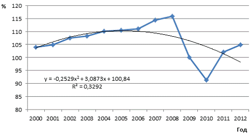 Таблиц 6 - Динамика индекса физического объема оказания платных услуг населению г. Уфы за 2000-2012 гг., %
