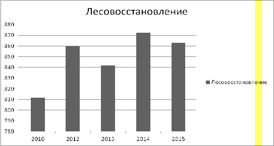 ) Начиная с 2012 по 2015 год ситуация по лесовосстановлению стабильна, наблюдается тенденция к росту. В 2015 году по сравнению с 2011 годом лесовосстановление увеличилось на 51,5 га.