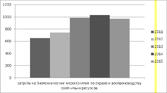 Полученная динамика затрат на ведение охотничьего хозяйства позволяет сделать вывод о том, что затраты на биотехнические мероприятия по охране и воспроизводству охотничьих ресурсов значительно возросли к 2015 году. Они составили 968 млн. руб., что на 313 млн. руб. больше, чем в 2010 году. Биотехнические мероприятия проводятся с целью улучшения условий обитания охотничьих животных и направлены на увеличение их численности. Это предопределяет возможность выделения двух крупных групп биотехнических мероприятий.