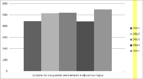 Динамика затрат по созданию охотничьей инфраструктуры не имеют общей тенденции к увеличение или к снижению. Показатель 2014 году был близок к показателю 2011, но в 2015 году затраты составляли 548 млн. руб., что на 106 млн. руб. больше, чем в 2014 году. Это связано с тем, что содержание охотничьей инфраструктуры в закрепленных охотничьих угодьях обеспечивается юридическими лицами и индивидуальными предпринимателями, заключившими охотхозяйственные соглашения.