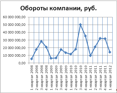 Наглядно поквартальное изменение товарооборота компании представим на