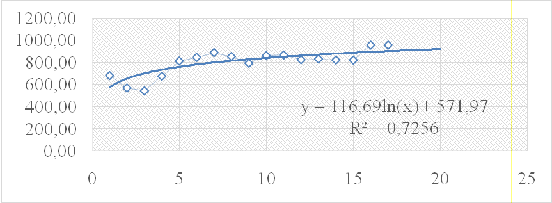 Модель логарифмического тренда выбрана согласно показателю коэффициента детерминации из предложенных уравнений регрессии в MSExcel . Значение коэффициента детерминации составило 72,56%. Таким образом, уравнение описывает 72,56% изменчивости результативного показателя.