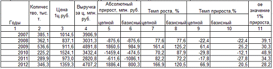 Таблица 1.1 - Расчет показателей динамики выручки от реализации подсолнечника по Воронежской области на 2007-2012 гг.