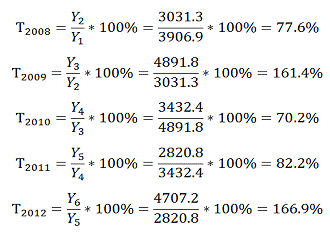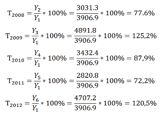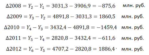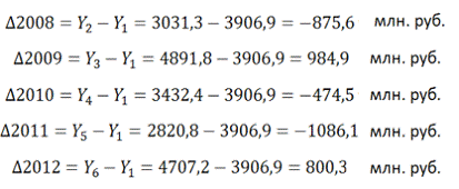 Методику расчета и экономический смысл этих показателей рассмотрим исходя из данных таблицы 1.1 Обозначим годы и соответственно, денежную выручку индексами Y1-2007г., Y2-2008г. и так далее до 2012 г. и выявим динамику выручки с помощью выше перечисленных показателей.