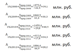 Так, если в 2008 году увеличение денежной выручки на 1% означало увеличение ее на 39,1 млн. руб., то в 2009 году это увеличение составило 30,3 млн. руб., то есть последовало уменьшение в динамике прироста денежной выручки, от реализации подсолнечника. Поэтому 2008-2012 годах в динамике этого показателя не наметился позитивный характер; постоянно то увеличивалась мера роста этого показателя, то уменьшалась.