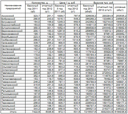 Следовательно, за счет улучшения структуры реализованного подсолнечника средняя цена данного вида продукции по Воронежской области в 2012г. увеличилась на 0,6% или 5,4 руб.