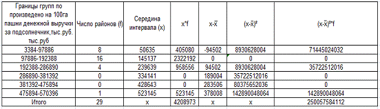 Рассчитанный коэффициент вариации превышает 63%, что свидетельствует о значительных колебаниях в произведено на 100 га пашни денежной выручки за реализованный подсолнечник, то есть размах вариации значителен.