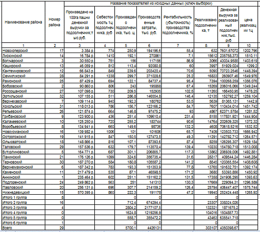 Таблица 3.3 Свободные показатели по группам районов по произведено на 100 га пашни денежной выручки за реализованный подсолнечник