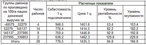 Была проведена аналитическая группировка, которая не показала определенную зависимость между произведено на 100га денежной выручки за реализованный подсолнечник и ценой реализации 1ц изучаемой культуры.