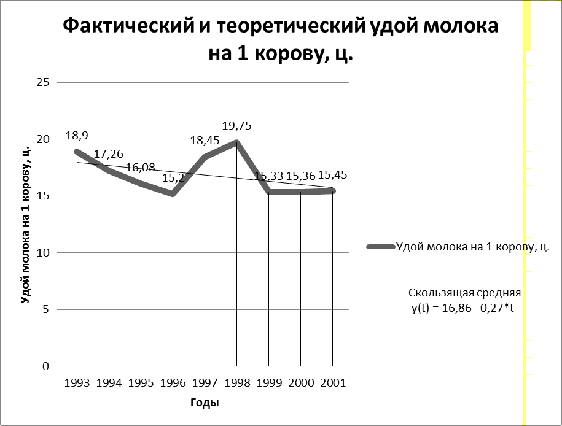 Данные показатели ряда динамики свидетельствуют о том, что ежегодно в течении изучаемого периода валовой надой молока от 1 коровы снизился на 0,43 ц/гол.