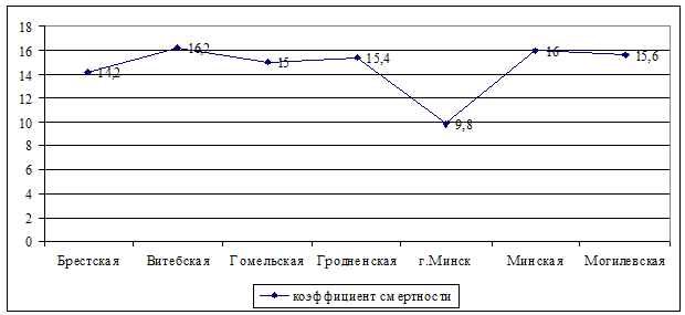 Высокий коэффициент смертности населения за анализируемый период отмечается в Витебской (16,2%), Минской (16%), Могилевской (15,6%), Гродненской (15,4%) и Гомельской (15%) областях. Низкий коэффициент смертности - городе Минске (9,8%), Брестской (14,2%) области (рисунок 1.2).