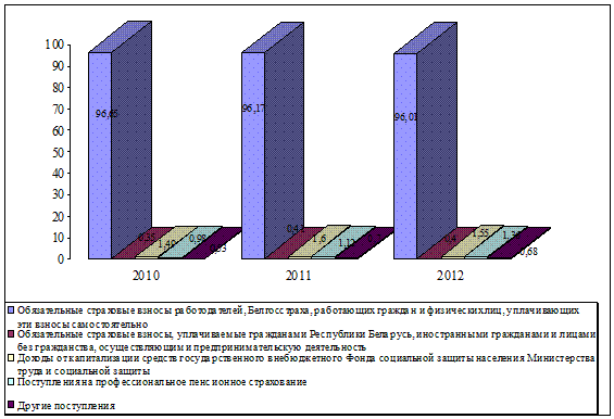 Взносы на профессиональное пенсионное страхование в 2012 году поступили в сумме 777,2 млрд. р. (в 2011 г. - 330,7 млрд. р., в 2010 г. -192,6 млрд. р.), и в общих поступлениях Фонда составили 1,4%, то есть по объему от всех поступлений данный показатель занимает третье место после страховых взносов организаций и доходов от капитализации средств.