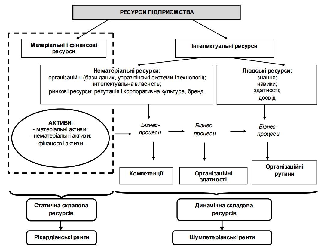 Натомість, залучення активів, та інших ресурсів інтелектуального характеру у систему бізнес-процесів підприємства дозволяє сформувати сучасні «ресурсні похідні» – компетенції, організаційні здатності та організаційні рутини, які становлять динамічну складову ресурсів.