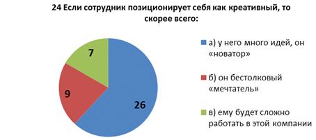 Опрос показал, что большинство сотрудников компании - 26 человек (62%) считают, что креативный человек это тот, у которого много идей. Однако есть и такие - 7 человек (16%), которые думают, что в NordEst такому сотруднику будет сложно работать, т.е. в компании существует ряд проблем, которые не позволят данному человеку реализовать свои идеи.