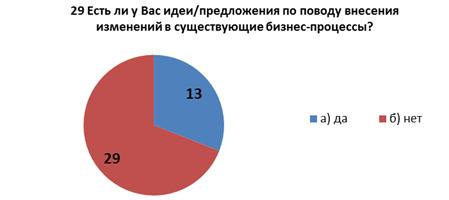 Из диаграммы (рисунок 2.12) видно, что у 13 сотрудников (31%) есть идеи или предложения внесения изменений в существующие бизнес-процессы. Компания NordEst занимается проектной деятельностью, поэтому в штате много руководителей проектов, которые наверняка имеют свое мнение на бизнес-процессы, которые существуют в компании и могут предложить что-то новое.