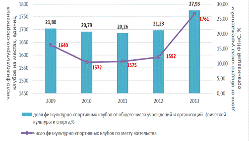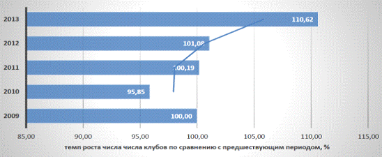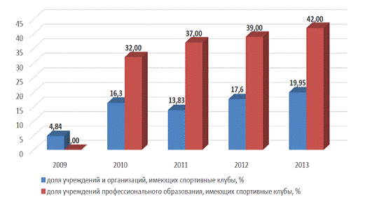 На начало 2013 года общее количество учреждений, предприятий, объединений и организаций системы физической культуры и спорта в РФ составило 169 253. Число образовательных учреждений в РФ, на базе которых могли функционировать спортивные клубы, составляло 92345, но из них реально имели спортивные клубы только 3,95%, в системе профессионального образования - 4,05%, а в системе среднего и высшего профессионального образования лишь - 4,99%.6 По месту жительства населения общее количество физкультурно - спортивных клубов составляло 7,52% от общего числа организаций системы физической культуры и спорта, из которых 61,10% являлись детскими и подростковыми клубами. Анализ доли организаций, имеющих спортивные клубы, подтверждает отсутствие у руководителей и собственников достаточного уровня мотивации и финансовых ресурсов для создания таких структур на фоне кризисных ожиданий - лишь 4,00% из них имели в своей структуре спортивные клубы. Из вышеизложенного следует вывод о значительном отставании темпов развития системы спортивных клубов в РФ от целевых значений.