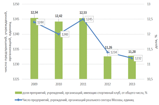 Характерной для мегаполисов проблемной зоной остается увеличение числа спортивных клубов, создаваемых на базе предпринимательских структур - предприятий, учреждений и организаций реального сектора. В Москве за пятилетие число спортивных клубов, созданных на их базе, сократилось на 10,9%, а доля предприятий, имеющих собственные спортивные клубы от общего числа предприятий, учреждений и организаций с 12,54 до 11,28% (рис. 5).