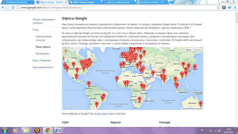 Как было сказано ранее, компания Google является транснациональной корпорацией. По всему миру, во всех концах света, кроме Антарктиды, расположены филиалы. Такое географическое многообразие и территориальный охват позволяет постоянно получать информацию и быстро реагировать на желания своих покупателей, учитывая специфику работы с каждым клиентом.