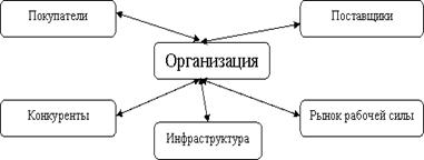 Не существует совершенной идеальной сферы контроля. Множество переменных снаружи организации и внутри могут влиять на нее. Кроме того, ни сфера контроля, ни «высота» структуры не является показателем величины самой организации. Внутренняя среда экономических организаций включает в себя следующие основные элементы: организационную структуру, управление персоналом, маркетинг, финансы, производство. Описание внутренней среды дает представление о слабых и сильных сторонах деятельности организации, ее внутренних вероятностях. Два других пространства составляют внешнюю среду фирмы. Рабочая среда - это среда непосредственных контактов с организацией, она содержит тех участников рынка, с которыми у организации есть прямые отношения или которые оказывают точное воздействие на организацию [13].