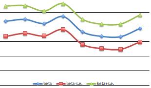 Динамика оценки коэффициента в доверительном интервале при переменной экспорта в модели с зависимой переменной lnta