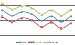 Динамика оценки коэффициента в доверительном интервале при переменной экспорта в модели с зависимой переменной lnni