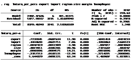 На данный момент, результаты получились следующие: наличие положительной связи между тем, занимается ли компания экспортной деятельностью и ее финансовой эффективностью применительно к российским данным действительно может быть замечена. Однако, как известно, эконометрический инструментарий позволяет определить лишь наличие этой связи, но не определить направление ее. Поэтому вопрос о причинно-следственных связей такого явления все же остается открытым, хотя нам и удалось определить, что различия в эффективности между двумя группами компаний - экспортирующими и неэкспортирующими существует. Однако предположение о том, что со временем разрыв этот будет увеличиваться, не нашло подтверждения. Поэтому на данный момент можно сказать, что обучение на экспорте за период с 2006 по 2013 годы по собранным данным не наблюдается.