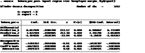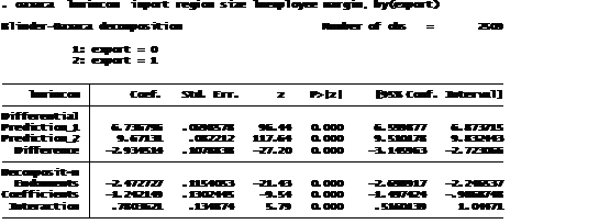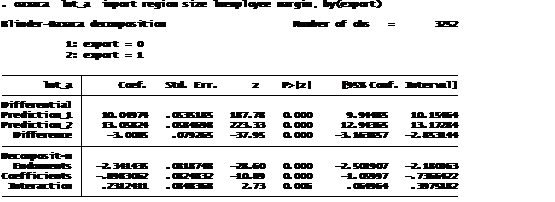 Baldwin J., Gu W. «Export-Market Participation and Productivity Performance in Canadian Manufacturing» / J. Baldwin, W. Gu // he Canadian Journal of Economics / Revue canadienned'Economique, Vol. 36, No. 3 (Aug., 2003), pp. 634-657 ., Wagner J. «Exports and Success in German Manufacturing» / A. Bernard, J. Wagner // WeltwirtschaftlichesArchiv, Bd. 133, H. 1 (1997), pp. 134-157J., Kostevc C. «Learning-by-Exporting: Continuous Productivity Improvements or Capacity Utilization Effects? Evidence from Slovenian Firms» / J. Damijan, C. Kostevc // Review of World Economics / WeltwirtschaftlichesArchiv, Vol. 142, No. 3 (Oct., 2006), pp. 599-614J., «Trade and productivity: Self-selection or learning-by-exporting in India/ J. Haidar» // Economic Modelling 29 (2012) pp. 1766-1773R., Pisu M. «The returns to exporting: evidence from UK firms» / R. Kneller, M.Pisu // The Canadian Journal of Economics / Revue canadienned'Economique, Vol. 43, No. 2 (May / mai 2010), pp. 494-519 R. «Male-Female wage differentials in urban labor markets»/ R. Oaxaca // International Economic Review, Vol. 14, Issue 3 (Oct. 1973) pp. 693-709F., Sutherland J. «Export Performance and Destination Characteristics of Irish Manufacturing Industry» / F. Ruane, J. Sutherland // Review of World Economics / WeltwirtschaftlichesArchiv, Vol. 141, No. 3 (Oct., 2005), pp. 442-459
