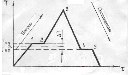 Для начала кристаллизации вещество необходимо охладить ниже Т0, а для плавления нагреть выше Т0.