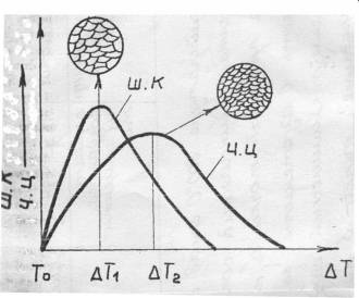 При увеличении переохлаждения до ∆Т1 наблюдается преимущественно увеличение скорости роста кристаллов, это приводит к возникновению крупных по величине кристаллов.