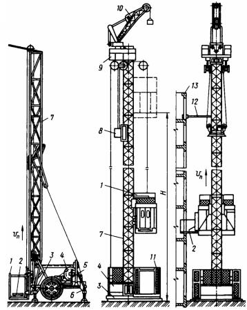 Рис. 56. Мачтовые строительные подъемники: а – грузовой; б – грузопассажирский; 1 – грузонесущий орган; 2 – платформа; 3 – опорная рама; 4 – реверсивная грузовая лебедка; 5 – пневмошины; 6 – винтовые опоры; 7 – вертикальная мачта; 8 – приводной механизм; 9 – оголовок; 10 – гусек; 11 – основание; 12 – стяжка; 13 – каркас здания