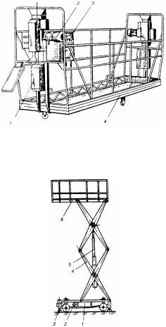 Рис. 58. Передвижные самоподъемные подмости: 1 – опорная рама; 2 – гидропривод; 3 – винтовые опоры; 4 – рычажное устройство; 5 – телескопические гидроцилиндры; 6 – рабочая площадка