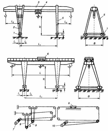 Рис. 78. Козловой кран: 1 – ходовые колеса; 2 – пространственная опора; 3 – мост; 4 – электроталь; 5 – плоская опора; 6 – грузовая тележка; 7 – реверсивные грузовыелебедки; 8 – грузовойполиспаст; 9 – траверса; 10 – лебедка передвижения тележки
