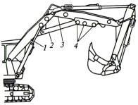 Рис. 89. Гидравлический экскаватор с составной стрелой и обратнойлопатой: 1 – корневая составляющая стрелы; 2 – ригель; 3 – удлиняющая составляющая стрелы; 4 – проушины