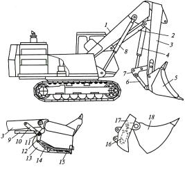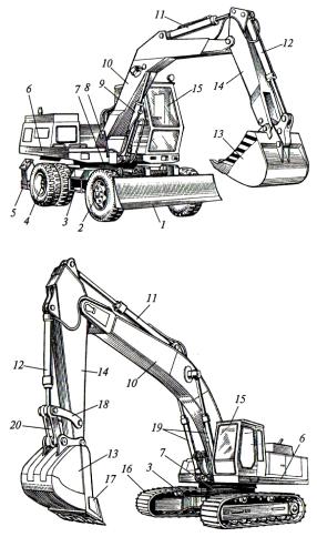 Рис. 90. Полноповоротные гидравлические одноковшовые экскаваторы: а – пневмоколесный; б – гусеничный; 1 – бульдозерный отвал; 2, 4 – ведущий мост; 3 – нижняя рама; 5 – откидные опоры; 6 – поворотная часть; 7 – опорно-поворотное устройство; 8 – стойки-пилоны; 9, 19 – проушины; 10 – стрела; 11, 12 – гидроцилиндры; 13 – ковш; 14 – рукоять; 15 – кабина машиниста; 16 – гусеничная тележка; 17 – подрезные зубья;